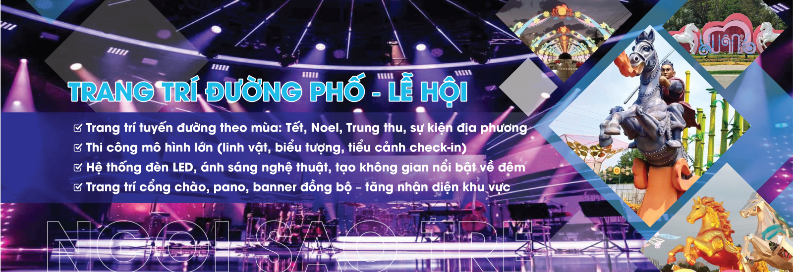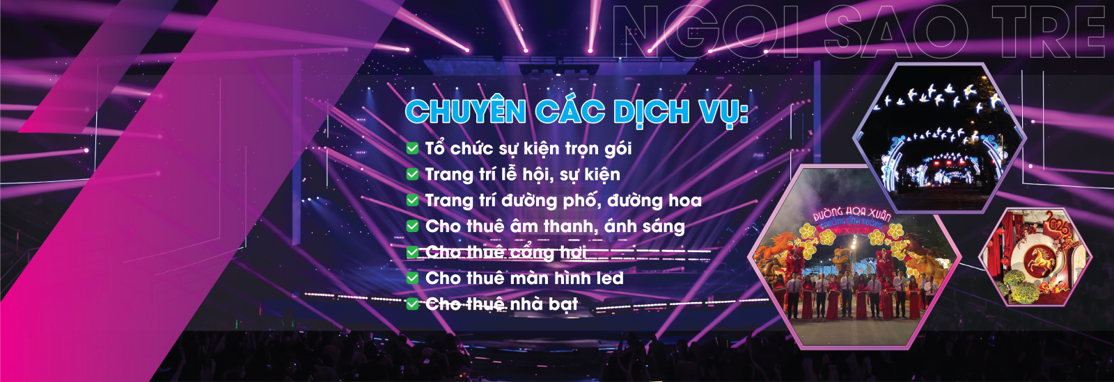 Bên cạnh đó, Ngôi Sao Trẻ còn cung cấp dịch vụ cho thuê thiết bị sự kiện chất lượng cao như cổng hơi, nhà bạt, âm thanh ánh sáng sân khấu và màn hình LED.